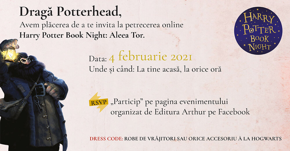 „Bine-ai venit în Aleea Tor!” Te-așteaptă o groază de lucruri magice de descoperit, dacă vrei să te pregătești pentru o vizită imaginară la Hogwarts. 4 februarie e data oficială pentru Harry Potter Book Night, dar noi am pregătit activități online pentru o săptămână întreagă, despre care poți afla dacă ne urmărești aici, pe pagina de Facebook Arthur și pe paginile partenerilor noștri.
